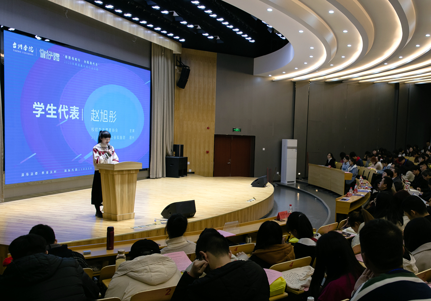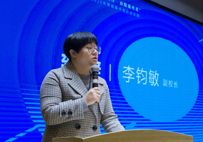 学生代表、我校2020年寒假社会实践团团长赵旭彤代表社会实践团队发言。她在讲话中号召所有在座同学不负嘱托,心怀感恩,遵守纪律,团结协作,以饱满的热情投入到这次活动中去,充分展现出台院学子尚德、敬业、和合、致用的面貌,做合格的“台院代言人”。