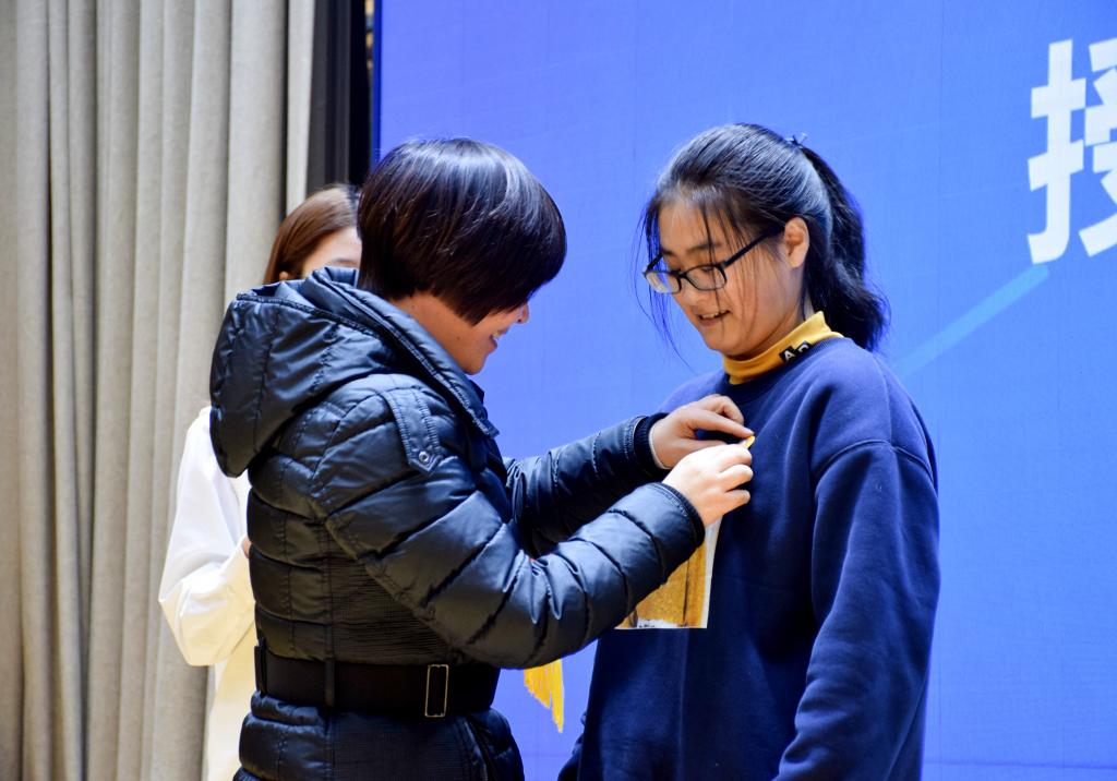现场,学校教务处处长、招生办公室主任金凌虹为学生代表佩戴实践徽章、工作证件,为本次活动授旗。