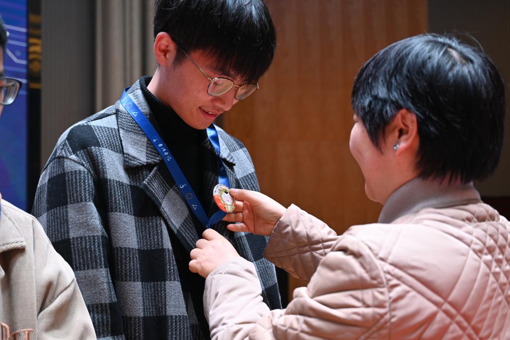 金凌虹和潘垚为2024年寒假社会实践学生代表佩戴活动徽章和工作牌,并为实践代表队授旗。