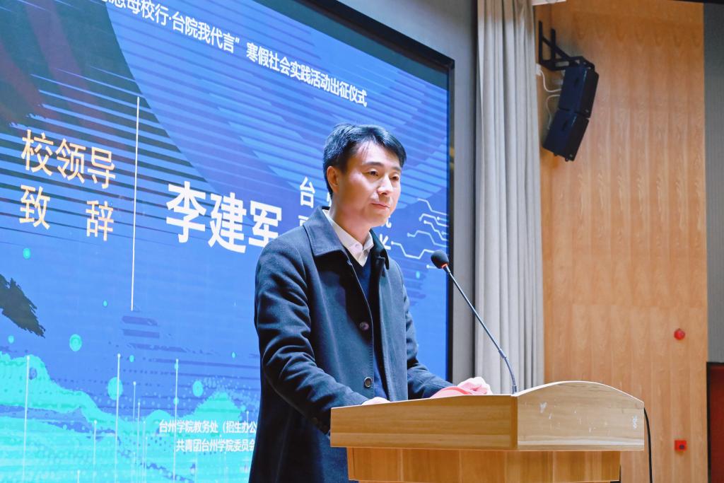 李建军代表学校党政向即将出征的社会实践队员表示亲切的慰问和良好祝愿,对相关部门和学院表示衷心的感谢,对历年我校学生在寒假社会实践工作中取得的成绩给予肯定,同时对今年我校寒假社会实践活动的规模和形式的变化表示赞赏,认为这反映了越来越多的台院学子投身台院的发展,增强台院的影响力。他勉励广大同学充分利用好寒假时间,以诚挚之心感谢母校高中的培养,以真诚之态做好“台院发言人” 。