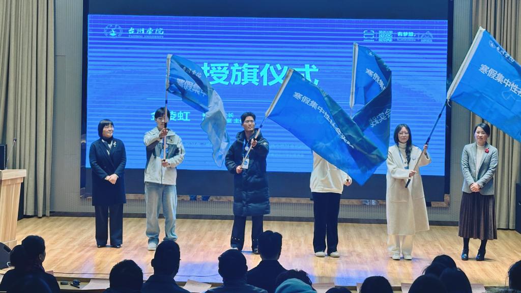 金凌虹、潘垚分别为2025年寒假社会实践学生代表佩戴活动徽章和工作证,并为实践代表队授旗。