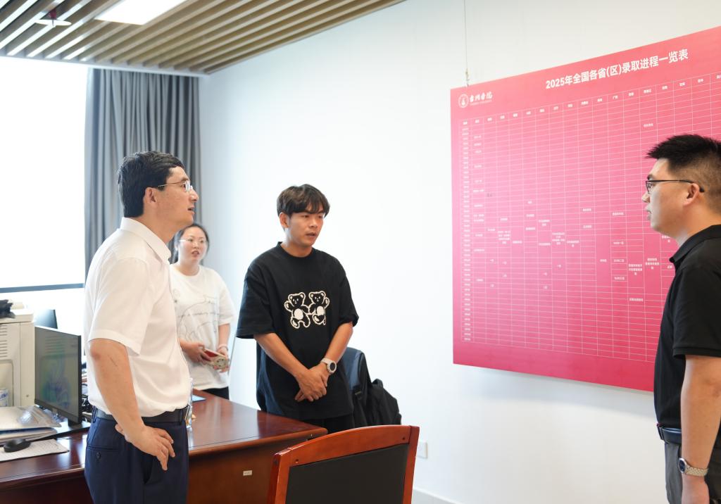 在本科招生录取现场,学校领导认真听取了教务处(招生办公室)关于近期学校全国各省(区)相关类型、批次的招生录取工作的汇报,详细询问了学校今年招生录取整体安排、当前进度进展,实地察看了录取通知书分装与邮寄工作,并慰问了暑期留校在岗师生,深入了解他们的学习生活情况。慰问期间,学校领导对下一阶段做好相关工作提出要求。招生工作,事关教育公平和社会期盼。学校各单位要一丝不苟做好录取工作,要做到招生录取有章可循、过程规范、数据准确,确保工作万无一失;要优化服务做好招生服务,在录取通知书寄送上用心用情,在招生热线咨询上耐心细致;要努力提升招生信息化水平,通过完善制度,建立校内平台,持续强化招生录取数据的运用和监管。